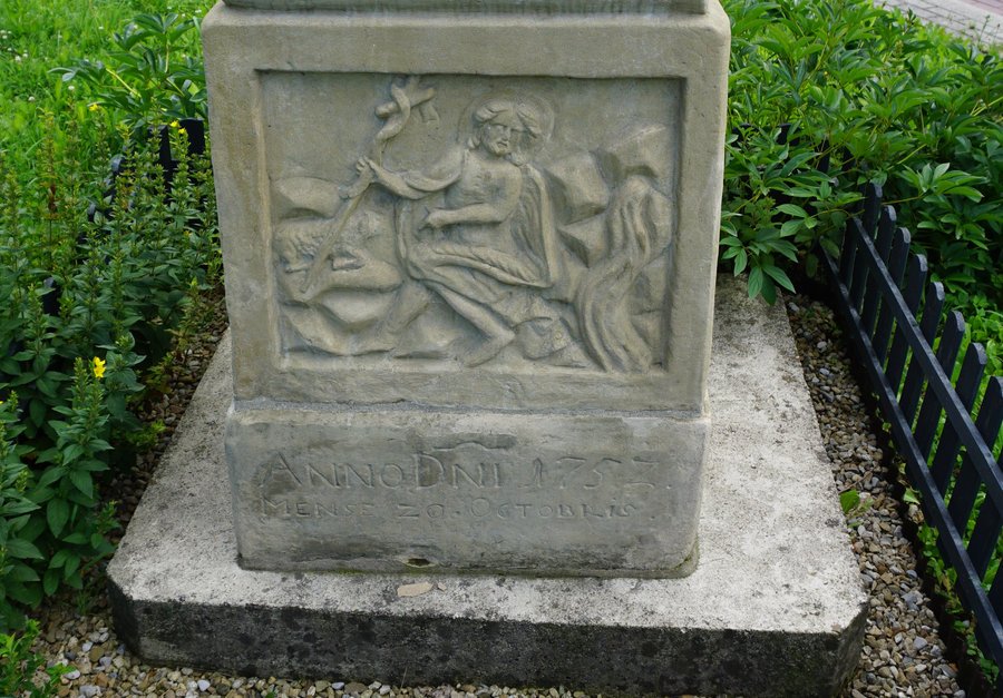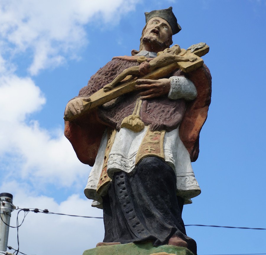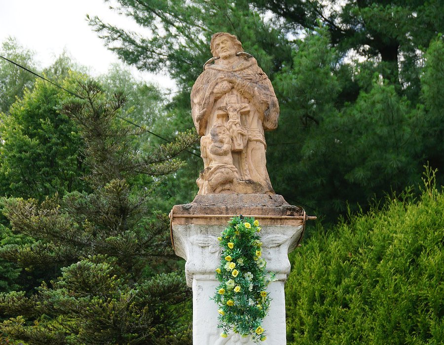 Wygląd. Figura św. Jana Nepomucena na dwuczęściowym postumencie, z mniej znanym przedstawieniem, malowana monochromatycznie. Obiekt wykonany z kamienia, ok. 2,5 m. wysoki, stan ogólny dobry. Należy poprawić opadający metalowy nimb. Pełnoplastyczna figura. Święty pomalowany na jasno kremowy kolor. Na linii żuchwy zamocowany metalowy nimb z pięcioma gwiazdkami, obecnie opadł na plecy. Głowa zwrócona lekko w prawą stronę, włosy falowane, wąsy, broda. Ubrany w pelerynkę z futra z długim włosem, wiązaną sznurem z chwostem, komżę z koronkami u dołu i przy mankietach, sutannę z guzikami. Ręce założone na piersi na krzyż, lewa ręka na prawej. Poniżej rąk krucyfiks z titulusem, trzymany w lewej ręce przez anioła, klęczącego przy prawej stopie św. Jana, prawą rękę trzyma na ustach. Figura stoi na zdobionym kapitelu. Postument część górna. Biały filar z kapitelem, stojący na wysokiej prostopadłościennej bazie. Od frontu na głowicy znajduje się płaskorzeźbiona głowa anioła ze skrzydełkami. Na trzonie w płytkiej niszy reliefowe ornamenty roślinne. Na bazie kartusz ze złotymi inskrypcjami: MSA i data poniżej 1772. Postument część dolna. Filar stoi na dwuczęściowym cokole, złożonym z mniejszej płyty kamiennej, malowanej na kolor figury i umieszczonej na wysokiej bazie z betonu. Otoczenie. Całość ogrodzona jest metalowym płotem, niższym od frontu, malowanym na czerwono. Lokalna tradycja. Wokół bazy betonowej rosną niewysokie iglaki i kwiaty jednoroczne. Pod figurą powieszona jest girlanda z kwiatów sztucznych z tkaniny w kolorze żółtym. Tradycyjne miejsce odprawiania majówek.