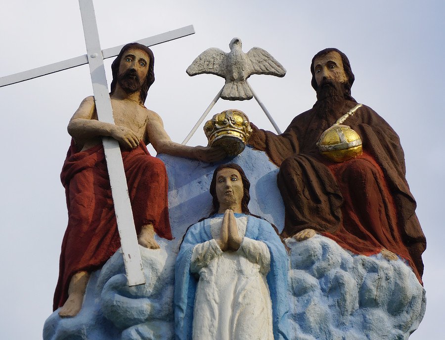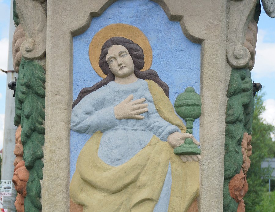 Wygląd. Rzeźba koronowania Matki Bożej przez Trójcę Świętą, na trzyczęściowym postumencie z piaskowca, polichromowana, wysoka ok. 5 m., w dobrym stanie, po niedawnej renowacji. Pełnoplastyczna rzeźba. Wszystkie odkryte części ciała figur i twarze w kolorze cielistym, włosy, wąsy i brody brązowe. Po prawej stronie Bóg Ojciec w czerwonej tunice i brązowym płaszczu, bosy, z insygniami królewskimi (berło i jabłko). Po lewej stronie Jezus w czerwonym płaszczu, z dużym, białym, metalowym krzyżem opartym o prawe ramię. Pomiędzy nimi biały gołąbek z rozpostartymi skrzydłami przymocowany dwoma białymi metalowymi prętami. Ojciec i Syn podtrzymują złoto-srebrną koronę z krzyżem nad głową Matki Bożej klęczącej na błękitnych chmurach. Ubrana w białą suknię i jasnobłękitny płaszcz. Poniżej stóp Jezusa dwie główki z białymi skrzydłami. Część górna postumentu. Filar z zielonym uskokowym kapitelem, jasnobrązowym trzonem, z niebieską niszą od frontu, w której ukazany jest w reliefie Jan Ewangelista w białej tunice i zielonym płaszczu, z piórem w prawej i księgą w lewej ręce. Część środkowa postumentu. Filar z zielonym uskokowym kapitelem, jasnobrązowym trzonem, z białą płyciną od frontu z napisem fundacyjnym: NA PAMIATKU VYSTAVIL IG JABLONSKY KASPEREK 1893 r. Część dolna postumentu. Zielony cokół ścięty od góry. Otoczenie. Placyk przy figurze wyłożony beżowymi, dużymi płytami betonowymi, okala go metalowy zielony płot. Po obu stronach płotu widoczne pnie starych drzew. Lokalna tradycja. Przed kapliczką rosną liczne kwiaty jednoroczne i wieloletnie. Po renowacji ok. 2019 r. przed figurą odbywają się po kilkunastoletniej przerwie majówki.