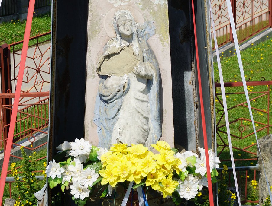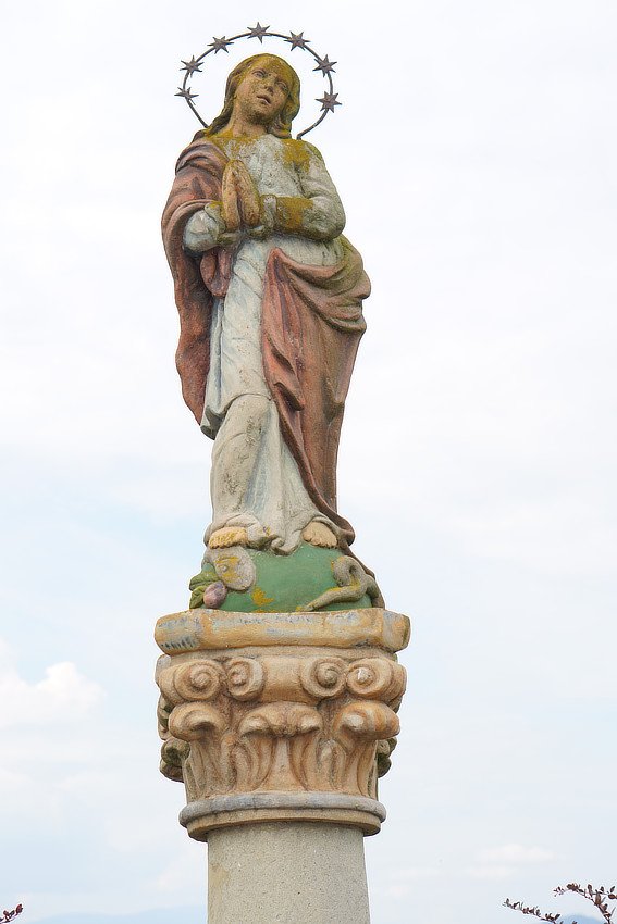 Wygląd. Kamienna kapliczka kolumnowa z figurą Najświętszej Marii Panny Niepokalanie Poczętej, z piaskowca, polichromowana. Wysokość ok. 4 metrów. Stan średni. Pełnoplastyczna figura. Maria z metalowym nimbem z 7 gwiazdami, z dłońmi złożonymi do modlitwy, stoi na półkulistym globie i bosymi stopami depcze węża trzymającego jabłko w paszczy. Ubrana jest w niebieską suknię i ciemnoczerwony płaszcz. Postument, część górna. Kolumna, lekko zwężająca się do góry, z głowicą koryncką, z z wielobocznym abakusem anulusem u dołu, malowana na kolor brudnobiały. Postument, część dolna. Niski filar z uskokowym kapitelem, stoi na wysokim betonowym cokole. Na trzonie z tyłu nieczytelne napisy, od frontu napis fundacyjny w płycinie: FUNDATOR DOBIAS ALBERTUSIAK AN 1809 DIE 6 JVLI. Otoczenie. W okolicy kościoła przy drodze na cmentarz, otoczona krzewami. Lokalna tradycja. Betonowy cokół obsypany ziemią, liczne nasadzenia kwiatów jednorocznych, po bokach dwa duże krzewy berberysu.