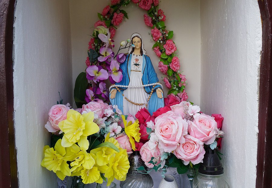 12. Murowana oszklona kapliczka wnękowa z figurką Niepokalanego Serca Marii, lata 60/70. XX w. [W pobliżu domu nr 68, ul. F. Machaya, osiedle Marchewki]