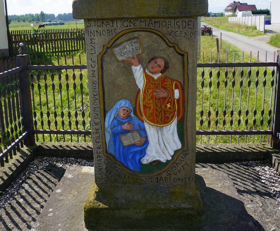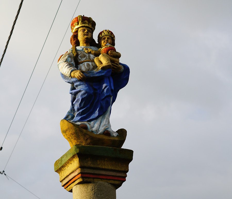 Wygląd. Kamienna figura Matki Bożej z Dzieciątkiem postawiona na wysokiej kolumnie, posadowionej na filarze, z reliefami św. Anny i Ignacego oraz inskrypcjami na trzech bokach. Kapliczka ma ok. 5 m wysokości, wykonana z piaskowca, polichromowana, stan dobry. Pełnoplastyczna figura. Matka Boża z Dzieciątkiem na lewej ręce, stoi na złotym półksiężycu. Ciała figur w kolorze cielistym, brwi i włosy brązowe, na głowach korony czerwono-złote, z metalowymi krzyżami u góry. Maria ubrana w białą suknię i niebieski płaszcz. Dzieciątko w lewej dłoni trzyma czerwone berło ze złotym krzyżem. Postument część górna. Kolumna zwieńczona uskokowym zielonym, żółtym i czerwonym kapitelem, stoi na niskiej bazie o zaoblonych krawędziach. Postument część dolna. Na filarze położony kapitel zwężający się ku górze. Inskrypcja: O MARIA MEMENTIO MEI. Na trzonie od frontu inskrypcje wokół płyciny z polichromowanymi dwoma reliefami: S.IGNATI IGNEM AMORIS DEI INNOBIS ACCENDE; S.ANNA PER FILIAE IESUM DUC NOS IN CAELUM ; EREXITV IN HREM O MARIA TVVM A.R.D. IGNAT JABLONSKI. Po lewej siedząca św. Anna, twarz i ręce koloru cielistego, brwi czarne, oczy białe, usta czerwone. Ubrana w niebieską suknię i jaśniejszy niebieski płaszcz ze złotą lamówką. Lewą ręką podtrzymuje książkę. Po prawej stronie stoi św. Ignacy, we wzniesionej prawej dłoni otwarta księga, widoczne litery VEM CICLORI. Brązowe włosy i oczy, czerwone usta. Ubrany w białą albę, szeroką u dołu i czerwony ornat z ciemnożółtym wzorem oraz złotą lamówką. Na lewej ręce przewieszony manipularz ze złotym krzyżem. Z prawej strony postumentu: ANNO 1753 DIE 26 MAII; z tyłu: R.V.AN.1824. Obiekt stoi na płycie kamiennej z piaskowca, położonej na betonowej bazie. Otoczenie. Przy drodze, na pastwisku. Wewnątrz ogrodzenia teren wybetonowany. Od frontu przy chodniku rosną byliny. Na pozostałej części, pomiędzy betonowym murkiem ogrodzenia a chodnikiem, wysypano drobny tłuczeń. Całość otoczona metalowym płotem. Lokalna tradycja. Do kolumny przymocowano bukiet kwiatów z materiału w kolorze różowym oraz wstążki od kolumny do płotku. Płot od przodu ozdobiony sztucznymi storczykami. Do czasu wybudowania kościoła (lata 90. XX w.), odbywały się tu majówki.