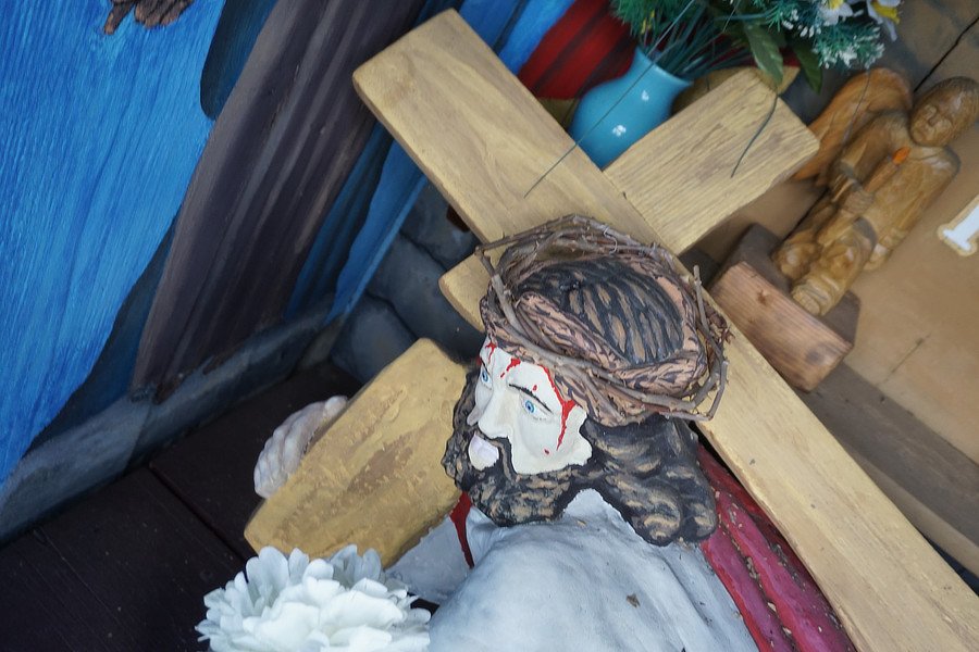 Wygląd. Krzyż kamienny z piaskowca, osłonięty z trzech stron blachą ocynkowaną, postawiony na słupie kamiennym, z uszkodzonym reliefem Matki Bożej Bolesnej, polichromowany, wysokość około 4 m. Stan zły, wymagający pilnej renowacji. Krucyfiks. Masywny ciemnoczerwony krzyż z rozszerzonym na dole trzonem, titulus biały z czarnymi literami INRI, płaskorzeźba Chrystusa biała, włosy i broda czarne, za głową wykute białe promienie nimbu, niebieskie perizonium. Postument. Krzyż postawiony na osłoniętym metalowym daszkiem kapitelu, z malowanym na zielono i zdobionym kostkami abakusem i uskrzydlonymi główkami poniżej. Na trzonie od frontu zniszczona płaskorzeźba - Matki Boskiej Bolesnej w niebieskim płaszczu i białej sukni. Twarz ledwie widoczna, figura bardzo uszkodzona Poniżej inskrypcje: Panu rolnici Novako .. octobra 1806. Otoczenie. Kapliczka otoczona oryginalnym, cztero-segmentowym, wykonanym w kamieniu arkadowym murkiem, spiętym metalowymi klamrami. Na zewnątrz murku znajdują się cztery słupy kamienne, połączone masywnymi, kutymi klamrami. Lokalna tradycja. Od osłon ramion krzyża do klamry spinającej słupy przypięto od przodu wstążki w kolorach białym i czerwonym. U stóp Matki Bożej kwiaty sztuczne w kolorach białym i żółtym, na murku podłużna skrzynka plastykowa w kolorze brązowym, z kwiatami żywymi, bratkami w kolorze żółtym. Niegdyś tradycyjne miejsce odprawiania majówek.