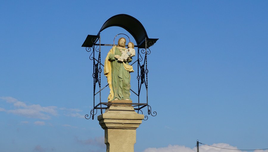 Wygląd. Figura św. Józefa z Dzieciątkiem postawiona na wysokim postumencie z piaskowca, polichromowana, wys. ok. 3 m., w bardzo dobrym stanie, po renowacji w 2018 r. Figura pełnoplastyczna. Święty Józef ukazany w całej postaci z młodocianym Jezusem na lewym ramieniu. Jego głowę okalają brązowe włosy i broda, twarz, dłonie i stopy koloru cielistego w odcieniu kremowym, ubrany w zieloną tunikę i żółty płaszcz na ramionach i plecach. Jezus o brązowych włosach, z kremowo różową twarzą, dłońmi i bosymi stópkami, ubrany w białą tunikę, w lewej dłoni trzyma jasnoniebieskie berło z krzyżem, prawą rękę nieznacznie unosi w geście błogosławieństwa. Figurka osłonięta brązowym blaszanym daszkiem łukowym. Część górna i środkowa postumentu. Filar o trzonie zwężającym się, a następnie u góry uskokowo rozszerzający się, z uskokowym kapitelem i umieszczonym nań impostem, z masywną bazą. Bez polichromii i zdobień. Część dolna postumentu. Cokół dwustopniowy, bez polichromii, z wysokim wyższym stopniem, z wyrytym od frontu napisem fundacyjnym: Ku čti Svatjeho Jozefa vistavil Ignač Jablonszky Kasperek 1878. Otoczenie. Przy drodze wylotowej ze wsi. Wokół liczne nasadzenia bylin i kwiatów jednorocznych. Ścieżka z płyt betonowych z lewej strony. Tradycja lokalna. W porcelitowych donicach rosną kwiaty jednoroczne, w wazonie stały cięte czerwone róże. Na drewnianym paliku umocowana jest lampka solarna. Miejsce modlitwy w akcji Różaniec bez granic.