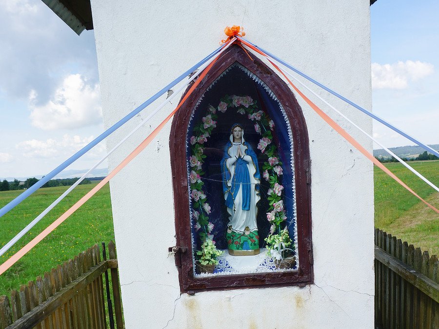 Wygląd. Murowana, tynkowana, biała kapliczka wnękowa, oszklona, z figurką Matki Bożej z Lourdes. Stan zły. Pęknięta ściana od frontu. Odpada tynk. Wymaga renowacji. Zewnątrz. Nakryta daszkiem dwuspadowym, blaszanym, zwieńczonym podwójnym krzyżem z nimbem promienistym. Murowana, z cegły, na betonowej podmurówce, tynkowana na gładko, malowana na biało. W murowanym szczycie szary krzyż, poniżej wnęka sklepiona łukowo, z szybą w drewnianej brązowej ramce. Wnęka. Na niewielkim podeście figurka Matki Bożej z Lourdes, ze złożonymi rękami, w białej sukni z lamówką pod szyją, przepasanej niebieską szeroką szarfą z długimi końcami, w długim do stóp niebieskim welonie, zarzuconym na głowę. W prawej ręce trzyma długi złoty różaniec. U stóp dwie złote róże. Stoi na zielonym podłożu z krzakiem róży i wytryskającym niebieskim źródłem. Otoczenie. Drewniany płot, w kolorze naturalnym, zamocowany na czterech metalowych prętach żebrowanych po rogach. Przed płotem dość duża rabatka z kwiatami wieloletnimi, obłożona otoczakami. Lokalna tradycja. Figurka we wnęce ozdobiona jest wieńcem z kwiatami w kolorze różowym. Przed figurką stoją dwie małe kompozycje z białymi kwiatami. Na płocie zamocowano duży bukiet sztucznych hortensji z tkaniny w kolorach białym i żółtym. Od szczytu wnęki do dwóch rogów płotu, od przodu, przytwierdzono wstążki, w kolorze białym, czerwonym i niebieskim. W ogrodzeniu, przed kapliczką rosną dwa bukszpany. Poza ogrodzeniem 6 dużych iglaków.