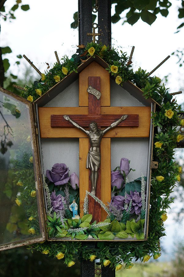 Wygląd. Krzyż metalowy z zawieszoną na nim oszkloną kapliczką skrzynkową zawierającą krucyfiks. Wysokość około 2 metry. Stan dobry. Zewnątrz. Metalowy, malowany na czarno krzyż z zaokrąglonymi ramionami, osadzony w metalowej obejmie zabetonowanej w podłożu. Zdobienia w kolorze złotym. Na przecięciu ramion krzyża znajduje się duża pięciokątna oszklona kapliczka skrzynkowa, drewniana, z krzyżykiem u góry. Witryna. Ściany w środku malowane na biało, w środku drewniany krzyż z metalową figurką Ukrzyżowanego i titulusem. Otoczenie. Krzyż stoi na wybetonowanym prostokątnym placyku, okolonym metalowym, średniej wysokości, czworobocznym płotem. Tradycja lokalna. Skrzynka kapliczki ozdobiona jest dookoła wieńcem z żółtymi kwiatami z materiału, wewnątrz kwiaty jasnofioletowe. Poniżej kapliczki, na krzyżu, znajduje się uchwyt na lampion, pod nim kwiaty sztuczne jasnobłękitne. Przed krzyżem donice z kwiatami żywymi w kolorach czerwonym, różowym i żółtym oraz duży lampion. W tym miejscu odbywają się procesje i nabożeństwa Drogi Krzyżowej, Bożego Ciała i Dni Krzyżowych. Podobne kapliczki znajdują się na Orawie wyłącznie w osiedlu Bory w Jabłonce.