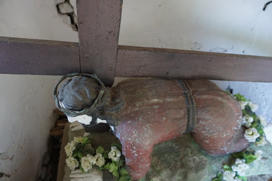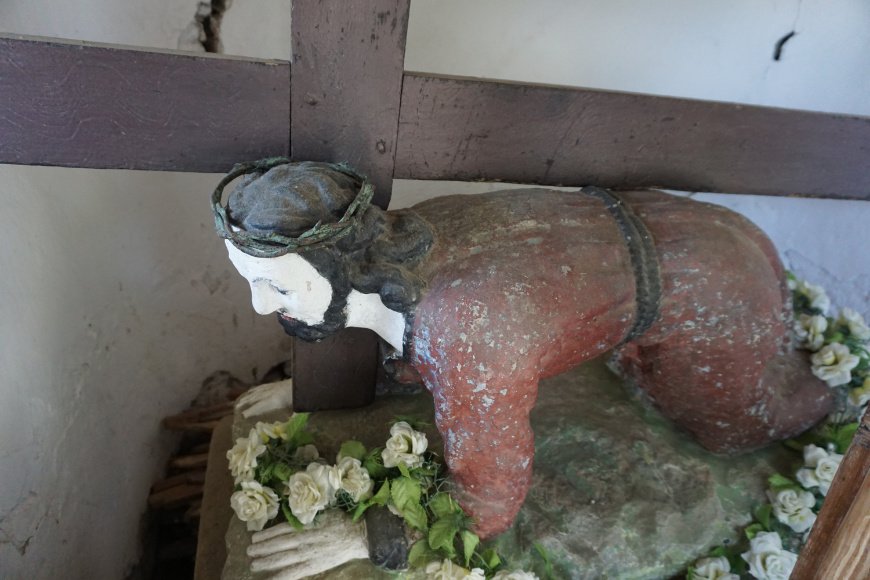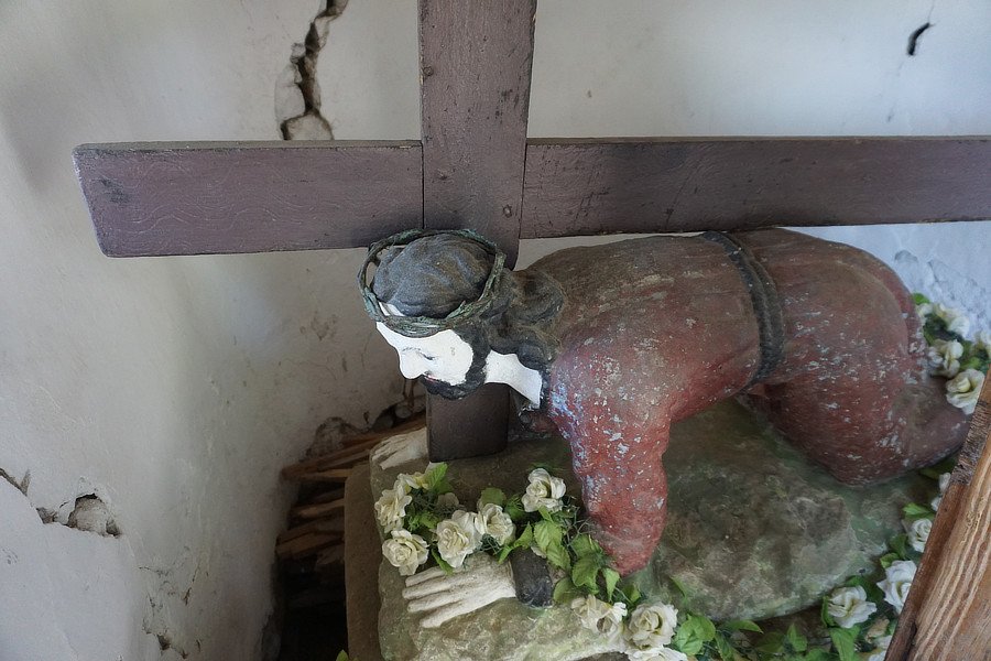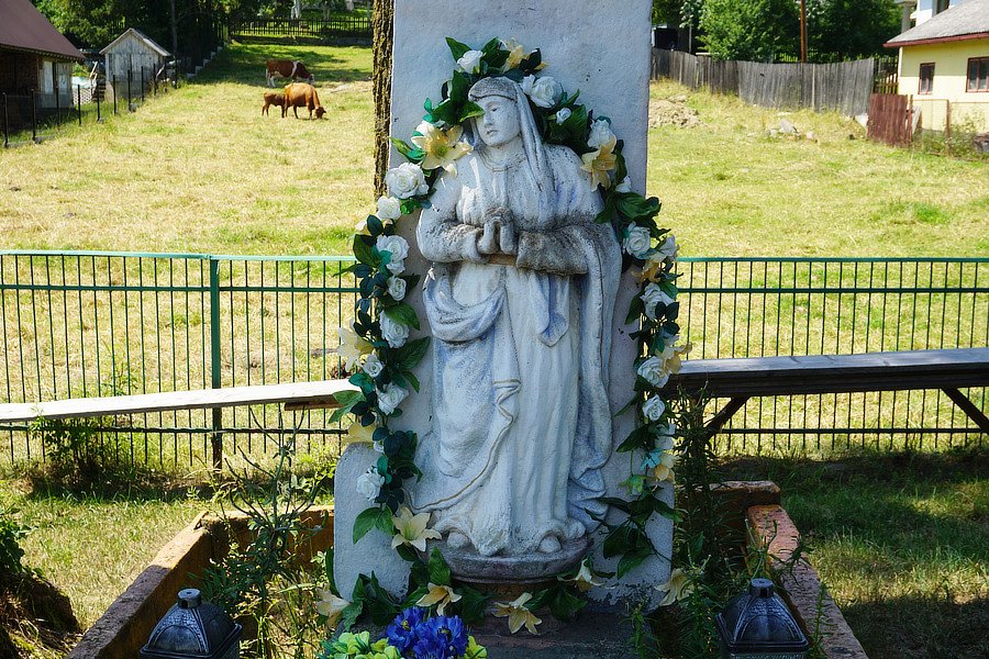 Wygląd. Kamienny krucyfiks słupowy na dwuczęściowym postumencie, z półplastyczna figurą Matki Bożej Bolesnej od frontu, z piaskowca, polichromowana, wysokość ok. 4 m. Stan dobry, po renowacji. Krucyfiks. Kamienny krzyż bez polichromii, z białym titulusem. Płaskorzeźba Chrystus w białym perizonium, złoty nimb. Krzyż postawiony na niewielkim kapitelu. Postument, część górna. Filar poszerzony po bokach zdobiony u góry i z dołu, płyciny z rozetkami po bokach, od frontu od góry dwie brązowowłose główki z białymi skrzydełkami, poniżej półplastyczna figura Matki Bożej Bolesnej, oczy białe, usta czerwone, stopy bose, w jasnoczerwonej sukni i niebieskim płaszczu, stoi na niewielkim półokrągłym cokole. Postument, część dolna. Niski blok kamienny z wyrytym od frontu napisem fundacyjnym: Na pamiatku dal i postavil ANNO 1907 JOZEF MORAWA i oznaczonym polem z datą. Otoczenie. Przy drodze głównej przez wieś. Figura ogrodzona drewnianym płotem, trawnik. Tradycja lokalna. Teren wyłożony żwirem, na nich donica z żywą hortensją. Nad głową Matki Bożej czarna lampa metalowa. Miejsce odbywania majówek i stawiania ołtarza w czasie procesji na Boże Ciało.
