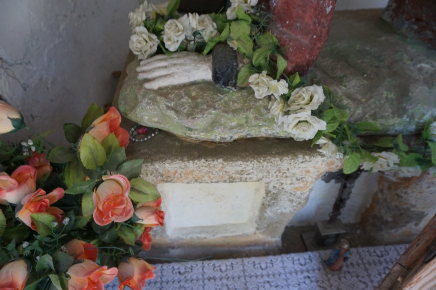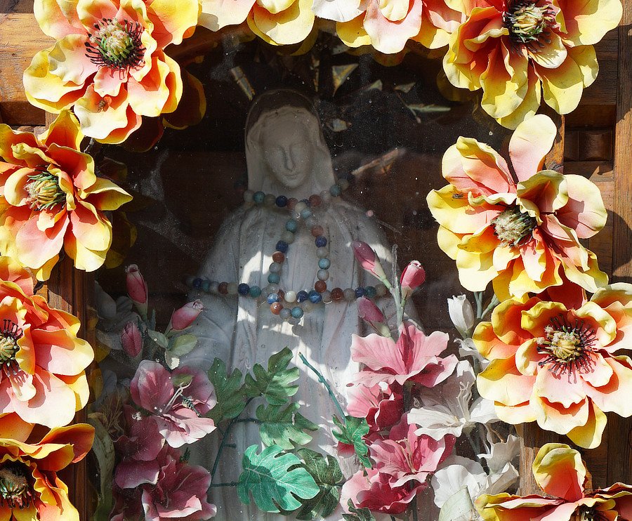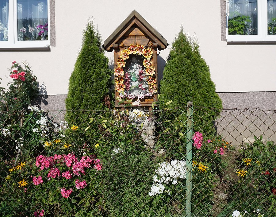 5. Kapliczka przydomowa, drewniana z figurką Najświętszej Marii Panny Niepokalanie Poczętej, 1984 r, Jolanta Domin [Przed domem nr 517]