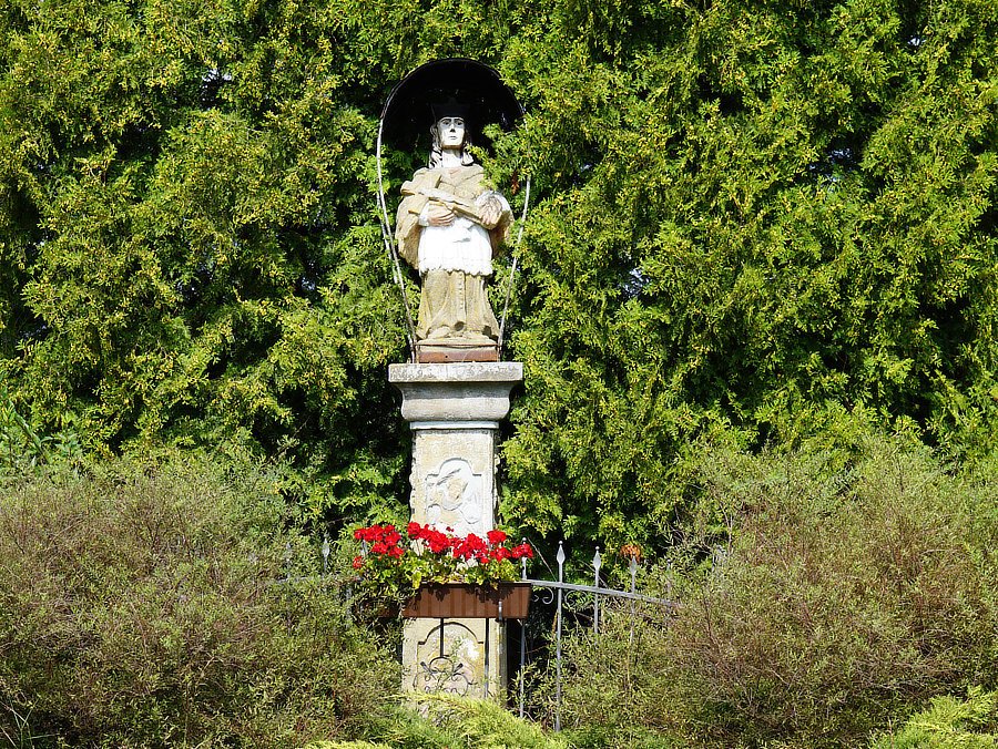 Wygląd. Kamienna figura z drewnianą głową św. Jana Nepomucena postawiona na dwuczęściowym postumencie z 4 reliefami oraz ornamentami po bokach. Wykonana z piaskowca i drewna. Polichromowana. Wysokość ok. 2,5 m. Stan zły, wymaga renowacji. Pełnoplastyczna figura. Św. Jan Nepomucen w czarnym birecie nałożonym na długie do ramion włosy, w sutannie z guzikami białej komży z koronką u dołu i przy rękawach, w jasno brązowej pelerynce, trzyma oparty o prawe ramię ciemnożółty krzyż z białą figurą Chrystusa. Głowa wykonana z drewna, pozostał część z kamienia. Figura osłonięta łukowym daszkiem metalowym. Postument, część górna. Filar malowany na biało, zwieńczony kapitelem, na jego licu data: 1758 inskrypcja. Na trzonie od frontu płycina, szaro-niebieska, z reliefem św. Archanioła Michała, w białej tunice, szaroniebieskim płaszczu, wysokich butach z cholewami, w prawej ręce miecz, w lewej okrągła tarcza. Z tyłu św. Barbara, w szarej koronie, białej sukni, z kielichem w prawej, a mieczem w lewej ręce. Po bokach biały ornament. Postument, część dolna. Od frontu św. Piotr, z promienistym nimbie nad głową, w blado różowym płaszczu. Z tyłu zniszczony relief św. Jana Chrzciciela,. Postument posadowiony na płycie kamiennej. Otoczenie. Położony przy drodze poza zabudowaniami.Teren zadbany, wokół liczne nasadzenia krzewów. Kapliczka otoczona metalowym brązowym płotem. Tradycja lokalna. Liczne kwiaty i krzewy, znicze. Miejsce odbywania mszy o urodzaje w maju.