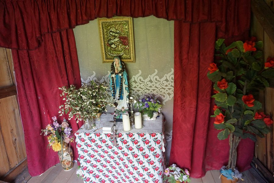 Wygląd. Murowana, malowana na biało kapliczka domkowa z figurą Serca Jezusa oraz dodatkową oszkloną wnęką nad drzwiami. Wysokość ok. 3 metry. Stan dobry. Zewnątrz. Murowana na planie kwadratu, tynkowana, malowana na biało. Drzwi drewniane, przeszklone. Nad nimi oszklona wnęka w brązowej ramie. W niej współczesna, niewielka figura św. Józefa, w białej sukni i żółtym płaszczu przerzuconym przez prawe ramię. Śpiące Dzieciątko w kremowej szacie. Kapliczka nakryta dachem czterospadowym, kryty gontem, u góry metalowy krucyfiks. Wewnątrz. Ściany tynkowane, malowane na biało, strop łukowy. Pod tylną ścianą murowany podest, z gipsową figurą Jezusa z gorejącym sercem. Jezus w białej sukni ze złotą lamówką przy rękawach i szyi, w czerwonym płaszczu. Lewą ręką wskazuje na czerwone serce, z zieloną koroną cierniową, na nim brązowy krzyż. Otoczenie. Kapliczka ogrodzona drewnianym, brązowym płotem na murku betonowym. Za płotem dwie wysokie tuje. Tradycja lokalna. Figura Jezusa otoczona jest gęstą girlandą z białymi i czerwonymi kwiatami sztucznymi, u stóp figury kwiaty sztuczne czerwone, żółte i białe. Wg starej legendy kapliczka stoi w miejscu zakopania żywcem nieznanej żebraczki, jako ofiary błagalnej o ustąpienie zarazy.