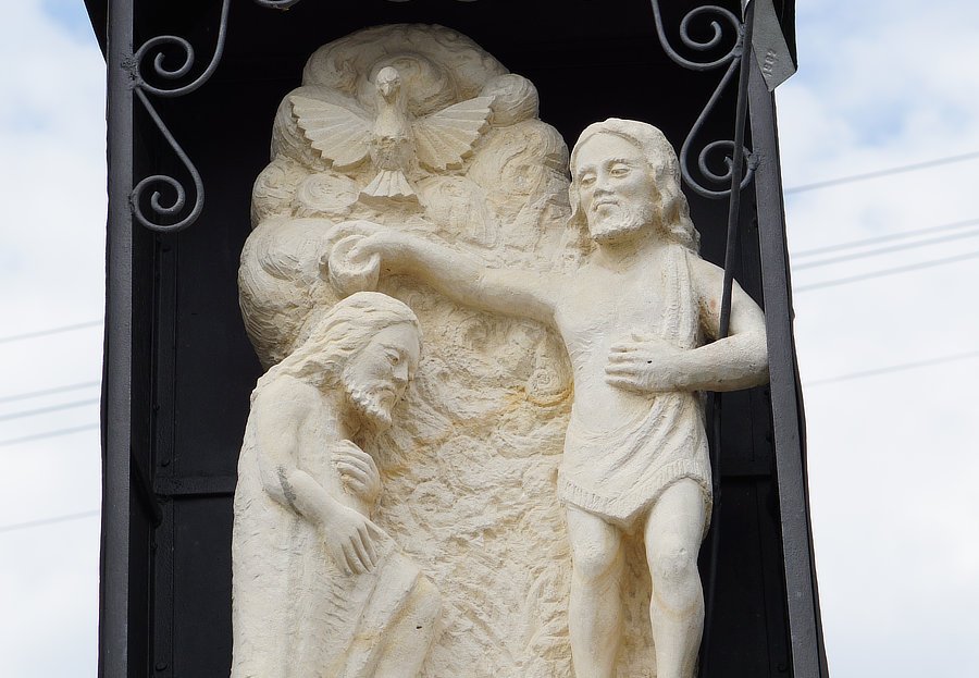 Wygląd. Przedstawienie Chrztu Pańskiego na dwuczęściowym postumencie słupowym. Wysokość ok. 3 m. Stan bardzo dobry. Figura. Scena Chrztu Pańskiego wyrzeźbiona współcześnie (1979 r.) w jasnożółtym piaskowcu pińczowskim, brak polichromii. Jezus ukazany z profilu po lewej stroni, powyżej Duch Święty w postaci gołębicy, św. Jan w przepasce biodrowej po prawej stronie, chrzci Chrystusa wodą z naczynia trzymanego w prawej ręce. W lewej trzyma metalowy krzyż z szatą na której widnieje data: 1982. Osłonięty z trzech stron metalową osłoną z daszkiem zwieńczonym krzyżem. Postument, część górna. Wysoki kamienny filar z płaskorzeźbionymi dwiema uskrzydlonymi główkami na kapitelu, pod nimi wmontowany metalowy hak. Niewielkie woluty u dołu. Z tyłu inskrypcja warsztatu: Belopo. Postument, część dolna. Kamienny blok z inskrypcją od frontu: Tuto Figure fundator Torgos Jon roku 1706 w oprofilowanej płycinie. Od tyłu i z boków obiektu brak widocznych zdobień i inskrypcji. Otoczenie. Kapliczka postawiona na skarpie, podejście do obiektu z boku. Tradycja lokalna. Kwiaty wieloletnie wokół płyty kamiennej. Miejsce odbywania procesji na Boże Ciało. Obok tablica granitowa, czarna z napisem objaśniającym różnice w datowaniu obiektu: Inskrypcja została wyryta podczas jednego z późniejszych remontów. Wprowadzono do niej fałszywą datę fundacji. Figurę tę fundował miejscowy gospodarz Jan Targos w latach 1833-1839 .