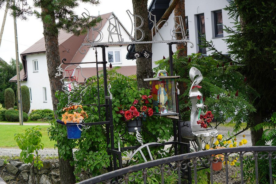 Wygląd. Metalowa, konstrukcja z centralnie umieszczonym napisem BABKA. Do niej przymocowana niewielka metalowa oszklona kapliczka. Z tyłu szkło malowane. W środku figurka Matki Bożej Niepokalanie Poczętej w białej sukni i welonie, w niebieskim płaszczu, ręce rozłożone, postawiona na malowanej kuli ziemskiej. Przed nią sztuczne ozdoby i lampiony. Po prawej stronie rzeźba z blachy przedstawiająca siedzącą kobietę z prawą rękę zbliżającą do czoła w geście znaku krzyża. Wokół sztuczne i naturalne kwiaty. Otoczenie. Kapliczka nietypowa ze względu na oryginalną konstrukcję metalową oraz położenie bokiem do drogi przy wjeździe do wiaty garażowej. Tradycja lokalna. Liczne kwiaty, nasadzenia świadczą o opiece nad miejscem. Postawiona jako prośba do Matki Bożej o ochronę. Data 1978 związana jest z rokiem, w którym właściciel (mieszkający na Słowacji) zaczął przyjeżdżać z dziećmi odwiedzać swoją matkę.