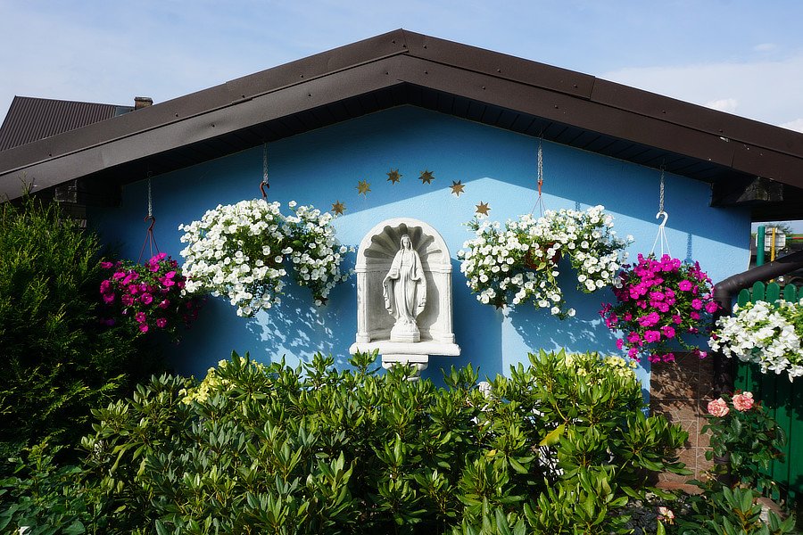 Wygląd. Kapliczka przydomowa z kamienną figurą NMP, na tle pomalowanej ściany budynku gospodarczego. Wysokość figurki ok 1 metr. Stan bardzo dobry. Kapliczka. Biała Figurka NMP Niepokalanie Poczęta z rozłożonymi rękami, stojąca w półokrągłej niszy ze żłobionymi pasami poziomymi, postawiona na postumencie. Po prawej stronie anioł i kamienna duża donica z jasnego kamienia. Otoczenie. Tłem kapliczki jest ściana budynku gospodarczego, pomalowana na niebiesko z 12 złotymi gwiazdami. Figurka stoi w ogrodzie kwiatowym z roślinami wieloletnimi i jednorocznymi. Tradycja lokalna. Kwiaty surfinii w wiszących doniczkach