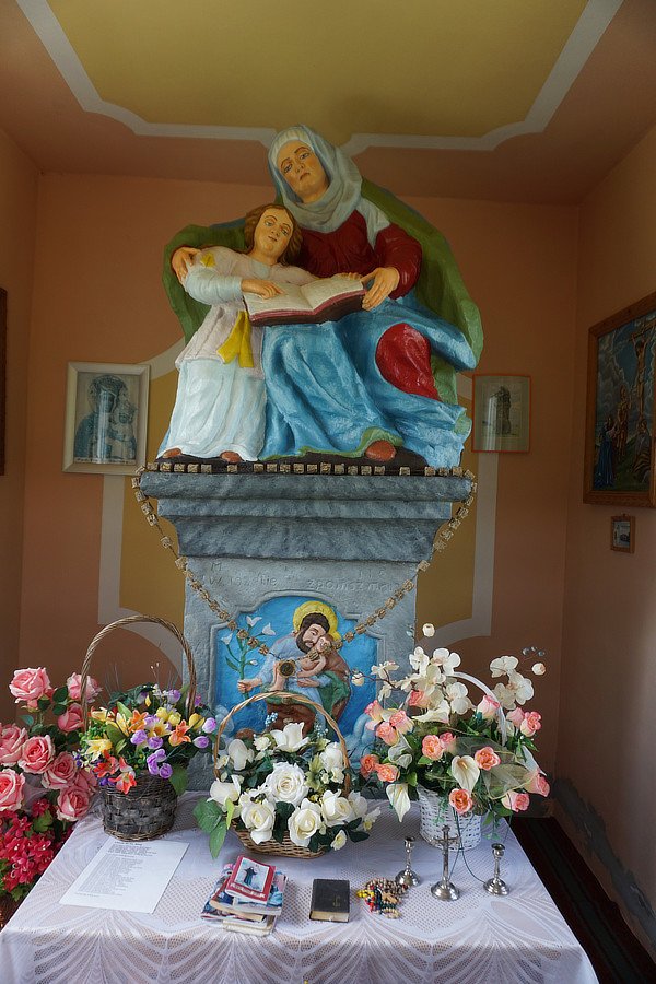 Wygląd. Kapliczka domkowa murowana, tynkowana. Wewnątrz kamienna zabytkowa rzeźba św. Anny z Marią na dwuczęściowym postumencie pokryta farbą olejną. Wysokość ok. 5 m. Stan bardzo dobry. Zewnątrz. Murowana, otynkowana i pomalowana na żółto. Plastykowe, białe okna i drzwi. Dach dwuspadowy, blaszany, brązowy. Na kalenicy od przodu metalowy krucyfiks. Na ścianie frontowej, na szczycie nad drzwiami, w płytkiej wnęce oszklona kapliczka z obrazem św. Michała Archanioła. Pełnoplastyczna figura. Rzeźba św. Anny z małą Marią na postumencie. Święta Anna siedzi z otwartą książką na kolanach i ramieniem obejmuje stojącą Marię. Ubrana w bladoniebieski welon, czerwoną suknię i niebieski płaszcz z zieloną podszewką. Maria z jasnobrązowymi włosami, ubrana w białą suknię i bladoróżową tunikę z żółtą podszewką. Lewą dłoń trzyma na książce. Postument część górna. Filar z profilowanym kapitelem, malowanym na szaro. Na trzonie od frontu w partii górnej napis: M… Ie Św. Jozefie zponisz mnie. Poniżej błękitna płycina z reliefowym przedstawieniem św. Józefa, który klęczy trzymając na lewym ramieniu małego Jezusa, w prawej trzyma białą lilię. Ma czarne włosy, brodę i wąsy, żółty nimb. Ubrany w bladoniebieską suknię, ciemnobrązowy płaszcz z zieloną podszewką, jasnobrązowe buty. Dzieciątko z nimbem, z białą przepaską na biodrach. Po bokach słupa gałązki i kolorowy kwiat. Postument dolny. Masywna szara baza w formie ciosa kamiennego z wyrytą od frontu modlitwą: Modłitwa. Święta Anno Maryey Matki Bożey Matko Y Jezusa Chrystusa Babko potężna tego Wnuczka Patronko przez oną miłość którą Cię Bóg moy Jezus y Maia corka twoja najsłodsza czcili Módl się za mną abym Was tak czcił y tak się ku śmierci gotował abym… Niżej data: R. 1724? Obnoveno 1870. Otoczenie. Ogrodzona metalowym niebieskim płotem. Po prawej stronie brzozowy krzyż. Tradycja lokalna. Postument opasany jest dużym różańcem. Na stole w sztuczne różnokolorowe kwiaty oraz przedmioty dewocyjne - obrazki i różańce oraz kartka z zapisanymi cudami, prośby i podziękowania od wiernych. Na ścianach liczne obrazy W latach 80/90. XX w. Wendelin Warciak zabudował figurę kapliczką domkową. W niedzielę po wspomnieniu św. Anny 26 lipca, odprawiane jest tu nabożeństwo. Miejsce majówek i osobistych modlitw.