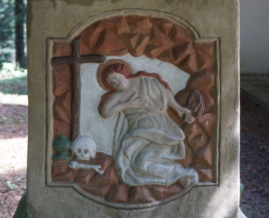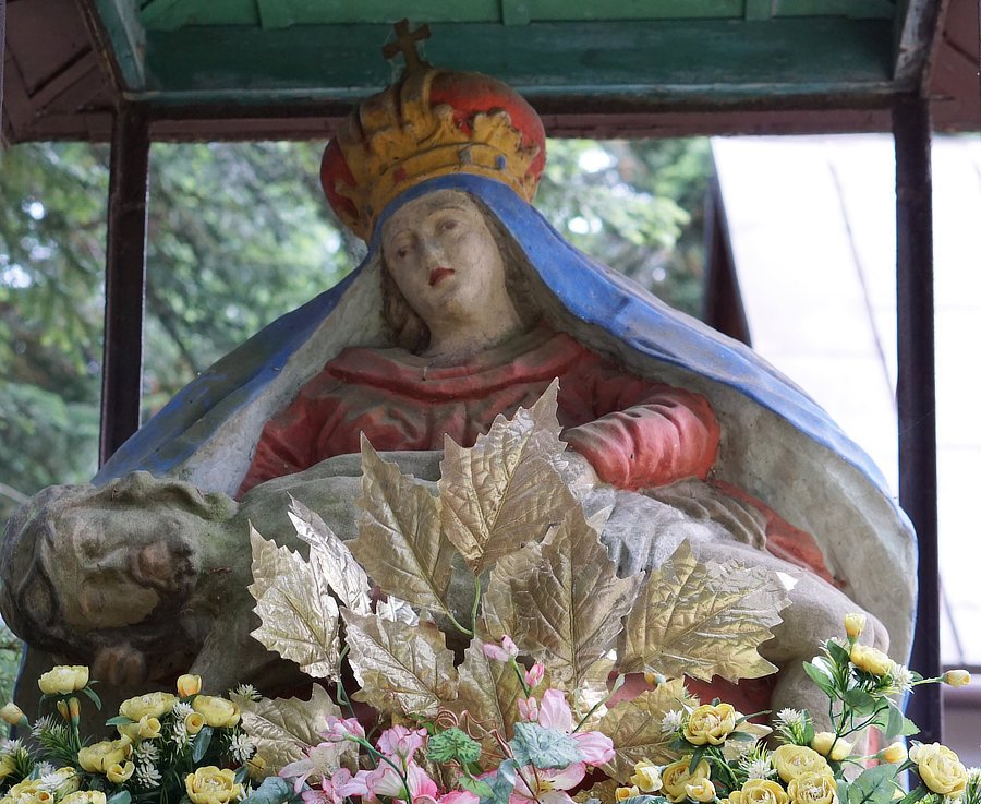 Wygląd. Kamienna figura Piety na dwuczęściowym postumencie słupowym, z reliefem św. Marii Magdaleny. Postument dolny z wyrytym napisem dewocyjnym z przodu i fundacyjnym z tyłu. Kapliczka o wysokości ok. 2,5 m, stan dobry. Pełnoplastyczna figura. Matka Boża w pozycji siedzącej, trzyma na kolanach zdjęte z krzyża ciało Jezusa. Twarz i dłonie figur koloru cielistego , włosy brązowe, czerwone usta. Ubrana w czerwoną, suknię i długi błękitny płaszcz z białą podszewką, zarzucony na głowę. Na głowie korona z krzyżem, złota, z czerwonym beretem. Ciało Jezusa w pozycji horyzontalnej, z głową zwróconą frontalnie, podtrzymywane prawą ręką przez Matkę. Kremowo białe ciało Jezusa, jasnobrązowe włosy, wąsy i broda, czerwony ślad po przebitym prawym boku, ze strużką krwi, perizonium białe. Rzeźba osłonięta brązowym daszkiem czteropołaciowym, zwieńczonym krzyżem. Postument górny. Filar z profilowanym kapitelem. Od frontu płycina, w niej płaskorzeźba Marii Magdaleny klęczącej przed brązowym krzyżem w jaskini. Po lewej stronie zielony kielich, po prawej biała czaszka z dwoma piszczelami. W prawej ręce świętej czarny bicz, składający się z trzech rzemieni. Ubrana w ciemno czerwoną suknię, płaszcz niebieski. Włosy brązowe, za głową żółty, wąski nimb. Po bokach słupa reliefy wici w kolorach zielonym, żółtym i czerwonym. Postument dolny. Masywna baza filaru o zaoblonych krawędziach z napisami od frontu: SALVATOR GENITRIXQVE … VOLITATVR HONORI …IAGDALIS I…V…STI… IOM…V i z tyłu: ANNO DNI 1749 dnie 12 JUNY, postawiony na szerokim cokole. Otoczenie. Posadowiony na szerokich kamiennych płytach złączonych metalowymi sztabami. Lokalna tradycja. Przed płytą znajduje się klomb, otoczony kamieniami, na nim rosną liczne kwiaty wieloletnie. Pod figurą bardzo duża kompozycja z kwiatów sztucznych białych i różowych, figura dookoła owinięta gęstym wieńcem z kwiatami w kolorze żółtym. Na płycie lampiony. Figura Matki Bożej ma ważne miejsce w kulturze lokalnej, zwana jest patronką Orawy. Każdego roku w niedzielę po 15 września, odbywają się tu msze święte, gromadzące licznie przybywających pielgrzymów z całej Orawy.