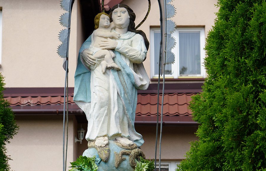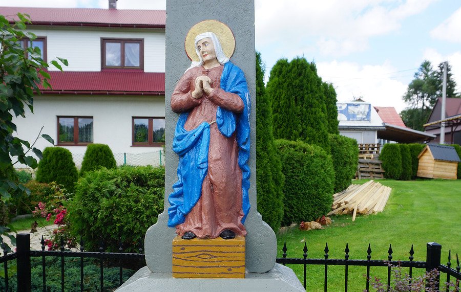 Wygląd. Kamienna figura Matki Bożej z Dzieciątkiem na dwuczęściowym postumencie słupowym. W górnej części reliefy świętych. Kapliczka polichromowana, ok. 3 m wysoka, w bardzo złym stanie, kamień się kruszy, odpada z polichromią. Wymaga pilnej renowacji. Pełnoplastyczna figura. Matka Boża w pozycji stojącej trzyma na prawym przedramieniu Dzieciątko, lewą ręką je obejmując. Odkryte części ciała są w kolorze cielistym. Maria z odkrytą głową, długimi, ciemnobrązowymi włosami, ubrana w białą suknię i jasnoniebieski płaszcz przerzucony przez prawe ramię. Dzieciątko o krótkich jasnobrązowych włosach zwrócone w jej stronę obejmuje Matkę. Matka Boża stoi na zielonym globie, prawą stopą przyciskając głowę węża leżącego przed jej stopami. Figura osłonięta jest srebrnym łukowym szerokim daszkiem brogowym. Część górna postumentu. Wysoki filar z malowanymi reliefami z czterech stron, zwieńczony uskokowym kapitelem. Na trzonie u góry płaskorzeźby uskrzydlonych ciemnowłosych główek, bardzo zniszczone z czterech stron słupa. Niżej od frontu bardzo słabo widoczna scena Ukrzyżowania, krzyż brązowy, białe ciało Chrystusa, niżej uszkodzona postać. Poniżej napis. Po prawej stronie relief św. Apolonii, w białej koszuli, niebieskiej sukni i czerwonym płaszczu, polichromia bardzo zniszczona. Trzyma w prawej ręce czarne szczypce z wyrwanym zębem, w lewej zielona gałązkę. Powyżej napis.: S.APOLONIA. Po lewej stronie słupa bardzo zniszczony relief, św. Łucja w białej tunice i żółtym płaszczu, z tyłu klęczący św. Jan Nepomucen z głową pochyloną w prawo, włosy, wąsy i broda brązowe, w czarnej sutannie, białej komży i brązowej pelerynce z chwostami, biret na ziemi po prawej stronie, nad nim krucyfiks figurką Ukrzyżowanego. Napis: S.IOANNES S.NEPOMUCENUS. Część dolna postumentu. Baza filaru z wysokiego ciosu kamiennego, w naturalnym kolorze, z wyrytą od frontu inskrypcję fundacyjną: ANNO DNI 1759 DIE 1 JUNII okoloną zielonymi gałązkami. Ślady niebieskiej polichromii. Baza stoi na betonowej niewysokiej i szerokiej płycie cokołowej. Otoczenie. W ogrodzie posesji. Z przodu dwie tuje zasłaniające figurę. Tradycja lokalna. Figura jest ozdobiona gęstym wieńcem z kwiatów sztucznych w kolorze żółtym i białym, od stóp Marii przez postument górny. Przed figurą zatrzymuje się procesja podczas Bożego Ciała. Niegdyś odprawiane były tu majówki.