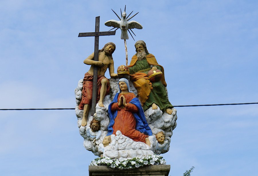7. Kamienna kapliczka słupowa z rzeźbą Koronowania Matki Bożej przez Trójcę Świętą, 1879 r., f. Adalbert Sizinka [Naprzeciw domu nr 28]