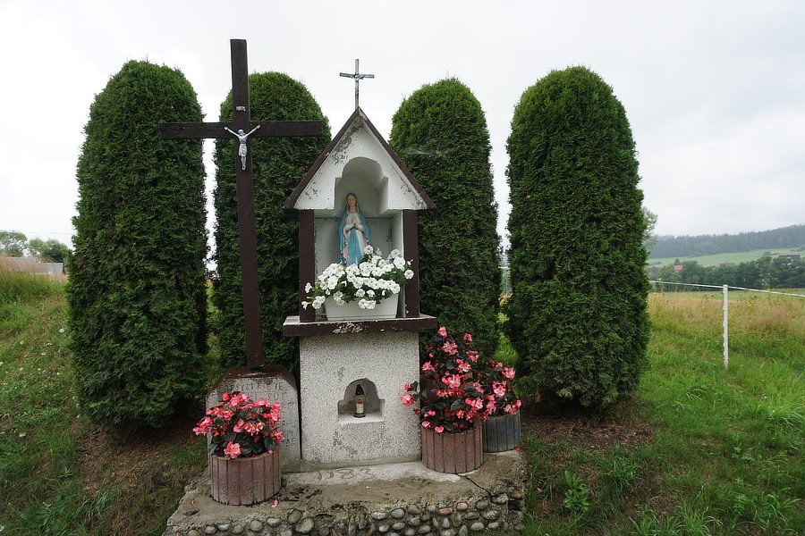 Wygląd. Murowana kapliczka wnękowa na postumencie betonowym (lastriko) ze współczesną figurką Matki Bożej. Po lewej stronie wysoki krucyfiks, pod którym zamieszczono tablicę fundacyjną. Wysokość ok. 2 metrów stan dobry. Kapliczka. Murowana kapliczka wnękowa, biała po bokach brązowa, tynkowana. W części górnej, z trójkątnym szczytem, dwustopniowa arkadowa wnęka z gipsową figurką Matki Bożej Różańcowej. Maria ukazana w całej postaci z rękoma złożonymi w geście modlitewnym. Ubrana w białą suknię przepasaną niebieską, szeroką szarfą z długimi końcami i długi welon w kolorze szarfy, ze złotą lamówką i różową podszewką. Na prawym przedramieniu zawieszony długi różaniec. Nakryta jest dachem dwuspadowym, brązowym, zwieńczonym drewnianym krzyżem z metalową figurką Jezusa w kolorze srebrnym. Postument. Betonowy, lastriko. Od przodu znajduje się krótka arkadowa nisza, w niej lampka na baterię w przezroczystym szklanym lampionie. Kapliczka postawiona jest na bazie betonowej, od przodu obłożonej drobnymi otoczakami, od góry malowanej na biało z datą wyżłobioną w betonie 1983. Krzyż i tablica. Po lewej stronie kapliczki sześciokątna, szara płyta betonowa z napisem fundacyjnym: WSYSTKIE TE FIGURKI SOM TRSES BOSKĄ OKAZCE I MOC KTÓRE SOM I TERAZ NA PAM DANE WARCIAK WENDELIN W R. 1983, w której wbetonowana jest metalowa podstawa krzyża. Krzyż drewniany, o wysokości kapliczki murowanej, z metalową figurką Jezusa i titulusem. Otoczenie. Kapliczka położona przy skrzyżowaniu lokalnych dróg. Tradycja lokalna. Przed figurką rosną w białej plastykowej skrzynce białe petunie. Na płycie dwa różowe i jeden szary, pionowo żłobione gazony z kwitnącymi różowo drobnokwiatowymi begoniami. Przed tablicą kwiaty żywe w jednym różowym obrzeżu betonowym. Za kapliczką i krzyżem 4 wysokie, formowane tuje.