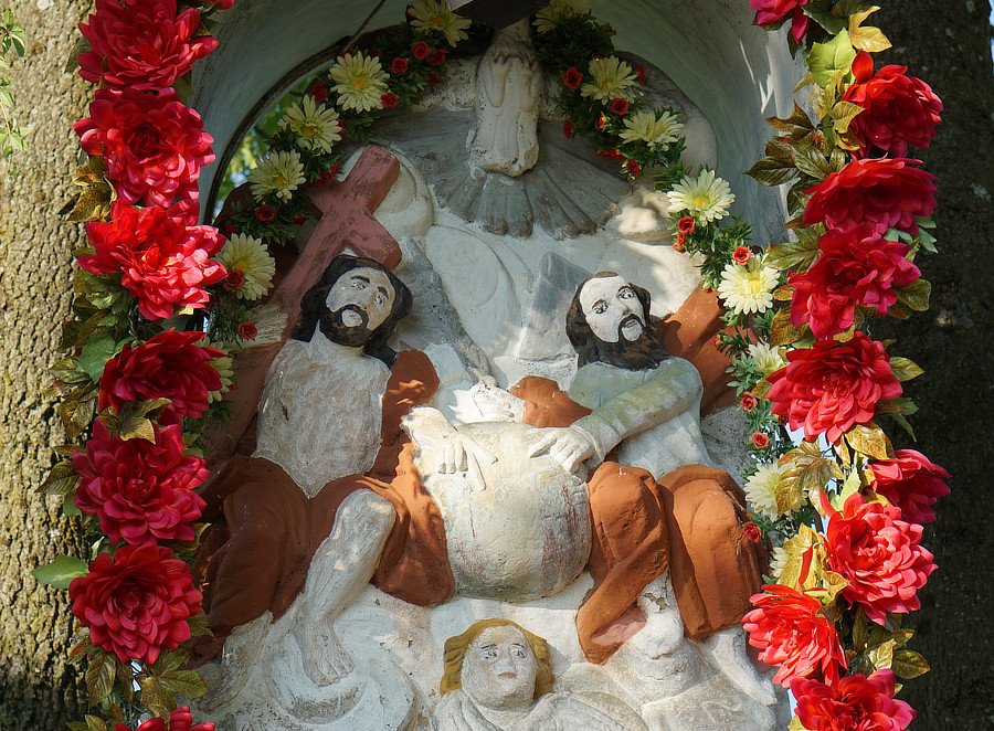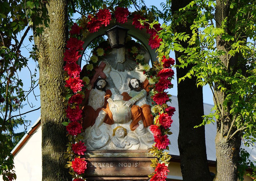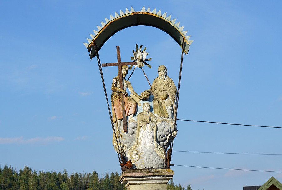 Ilustracja: Kamienna kapliczka słupowa z rzeźbą Trójcy Świętej, 1760 r., Zubrzyca Dolna