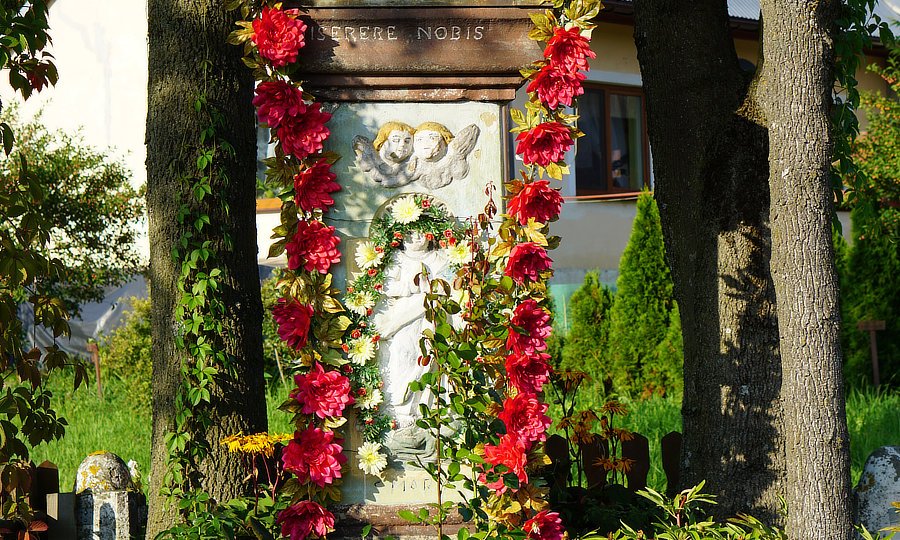 3. Kamienna kapliczka słupowa z rzeźbą koronacji Matki Bożej przez Trójcę Świętą, 1891 r., f. Jan i Ignac Gyurcsak, [W ogrodzie posesji nr 36A, Zubrzyca Górna]