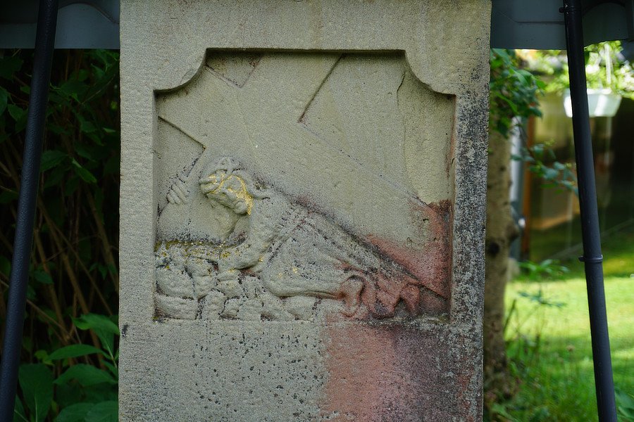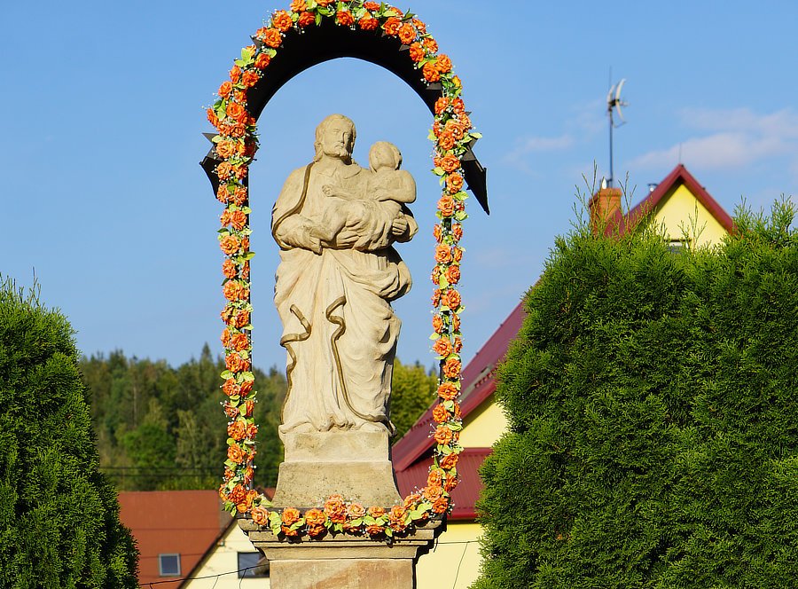 Wygląd. Kamienna figura św. Józefa na podwójnym postumencie słupowym. Ślady białej polichromii, postument w kolorze naturalnego kamienia. Wysoka ok. 3 metry, stan dobry. Figura pełnoplastyczna. Św. Józef z Dzieciątkiem na lewym przedramieniu. Cała figura jasna z wyjątkiem ciemnobrązowej lamówki na płaszczu. Józef ubrany w tunikę i płaszcz zarzucona na ramionach. Dzieciątko w przepasce na biodrach. Figura postawiona na kapitelu i dwustopniowej podstawie. Dach, blaszany, zdobiony od przodu. Postument, część górna. Wysoki filar kamienny, z trzonem rozszerzonym uskokiem na górze i owalnie na dole. Bez polichromii. Postument, część dolna. Niski blok kamienny z oznakowanym polem z inskrypcją: SVATY JOZEFE ORODUI ZA NAS 1876. Postawiony na płycie betonowej. Otoczenie. Dwie duże tuje po bokach. Płot metalowy z siatki, bramka spawana, malowany na brązowo. Dwa pnie po starych drzewach. W środku reszki ogrodzenia kamiennego. Tradycja lokalna. Wieniec z pomarańczowymi kwiatami na przednich prętach, daszku i podstawie. Kiedyś stacja w procesji Bożego Ciała.
