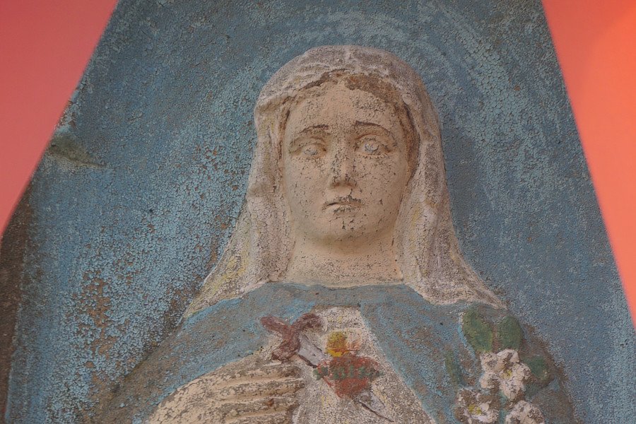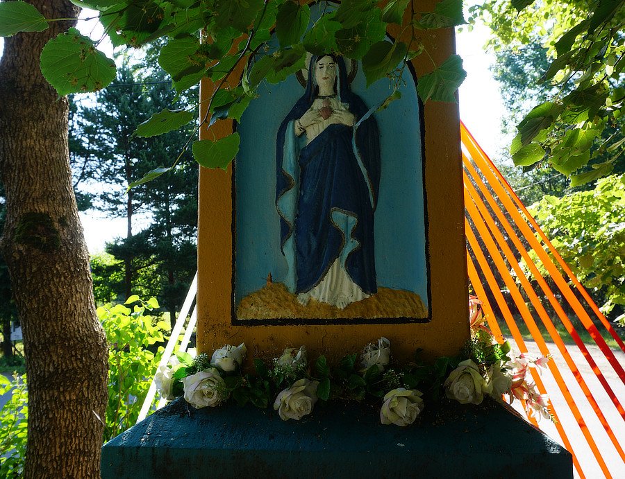 Wygląd. Drewniana kapliczka, z gipsową figurką Najświętszej Marii Panny Niepokalanie Poczętej, osłonięta daszkiem wspartym na czterech słupkach. Wysokość ok. 2 m, stan bardzo dobry. Kapliczka. Figurka NMP Niepokalanie Poczętej w rozłożonymi rękami, włosy brązowe, niebieski płaszcz i biała suknia. Osłonięta blaszanym daszkiem podpartym czterema drewnianymi, brązowymi słupkami, z metalowym krzyżem. Kapliczka postawiona jest na pniu drzewa. Otoczenie. Kapliczka przed domem, w ogrodzie, urządzona jako kwietna wyspa z licznymi w kwiatami wieloletnimi i jednorocznymi. Przed figurką gipsowa duża, biała owieczka. Tradycja lokalna. Słupki udekorowane bukietami z kwiatów sztucznych, różowych, czerwonych i białych. Na głowie NMP łańcuch choinkowy ze srebrnej folii.