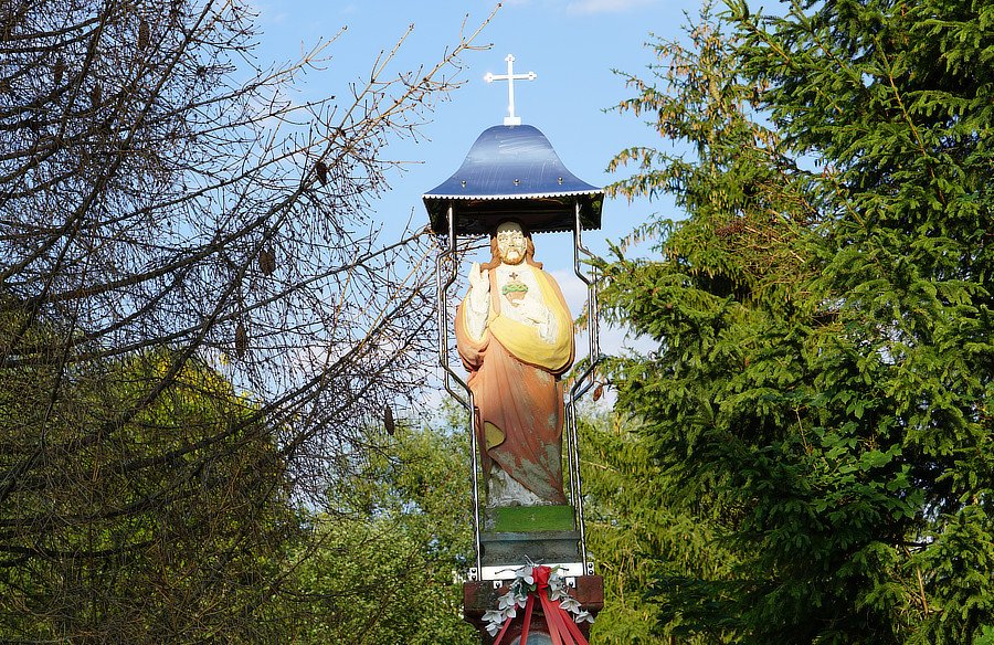 Wygląd. Kamienna figura Jezusa na trzyczęściowym postumencie, z jednym reliefem od tyłu i 3 malowidłami we wnękach. Zbudowana z piaskowca. Polichromowana. Wysokość ok. 3, 5 m. Stan dobry. Pełnoplastyczna figura. Stojąca postać Jezusa, prawą rękę wznosi w geście błogosławieństwa, lewą wskazuje na czerwone serce na piersi, z brudnobiałą koroną cierniową, żółtym płomieniem u góry i krzyżem. Twarz i dłonie cieliste, włosy i broda brązowe. Ubrany w białą suknię i czerwony płaszcz. Stoi na kapitelu. Figura osłonięta jest metalowym daszkiem. Tył i boki figury osłonięte płytą półprzezroczystą z pleksi. Na daszku krzyż metalowy. Postument, część górna. Filar malowany na żółto z 3 malowidłami świętych i 1 reliefem, w niebieskich niszach. Od frontu malunek św. Wojciecha w złotej mitrze, białej komży, czerwonym ornacie z krzyżem w prawej ręce i czarnym pastorałem w lewej. Napis: SV. WOJCIECH . Z lewej strony św. Alojzy w czarnej sutannie i białej komży, czarne krótkie włosy i buty, ręce złożone modlitewnie. Napis: SV. ALOJS. Z prawej. Św. Klementyna, czarne długie włosy, biała suknia przepasana złotą szarfą, w różowym płaszczu. Napis: SV. KLIMENTINA. Z tyłu relief NMP z Niepokalanym Sercem, w białej sukni, niebieskim płaszczu z jasnoniebieską podszewką na głowie, obiema rękami wskazuje na umieszczone czerwone serce z płomieniem. Postument, część środkowa. Blok kamienny malowany na pomarańczowo. Od frontu z białą płyciną wgłębną z inskrypcją: SERCE JIZISOVO OTPUT LUDU TVOJMU A SITKIM TIM KTORI TIA VZIVAJU FUNDATORI WOJCZAK ALOJS A KLIMENTINA ROK 1917. Postument część dolna. Niski zielony blok kamienny. Otoczenie. Kapliczka wolnostojąca, z przodu dwa jesiony, z tyłu dwie lipy. Ogrodzona metalowym, zielonym płotem. Tradycja lokalna. Figura udekorowana wieńcem z czerwonymi i białymi kwiatami. Dodatkowo szarfy w kolorze białym i czerwonym przymocowane do płotu. Na postumencie kolejne kwiaty w kolorze różowym białym i fioletowym. Na dole bukiet z pomarańczowymi różami.