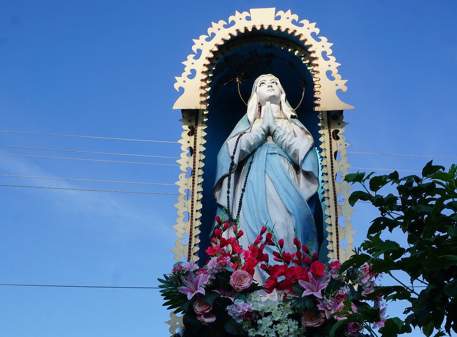 Wygląd. Kamienna figura Matki Bożej Różańcowej na dwuczęściowym postumencie słupowym postawiona na niebieskim betonowym podium. Wykonana z piaskowca. Polichromowana. Wysokość ok. 3,5 m. Stan dobry. Pełnoplastyczna figura . Matka Boża Różańcowa stoi ze złożonymi do modlitwy rękami, ze wzrokiem skierowanym do góry, za głową złoty metalowy nimb z pięcioma gwiazdami. Ciało białe, oczy niebieskie. Ubrana w białą suknię przepasaną niebieską szarfą i niebieski płaszcz ze złotą lamówką na brzegach zakrywający głowę. Z prawego strony czarny długi różaniec. Figura nakryta metalową, łukowo zwieńczoną osłoną z trzech stron z daszkiem, od przodu ze zdobieniami. Stoi na rozbudowanym kapitelu w kolorze niebieskim, białym i czarnym. Postument, część górna. Filar o przekroju ośmioboku, z błękitnym kapitelem, kremowo żółty z białą płyciną, z czarną inskrypcją. Postument, dolna część. Baza filaru, w formie bloku o przekroju ośmioboku, nieco szersza niż trzon, kremowo żółta z napisem fundacyjnym od przodu, jasnoniebieskim profilem u góry. Postawiony na niebieskim dwustopniowym cokole betonowym. Otoczenie. Figura stoi w przy głównej drodze, ogrodzona zielonym płotem metalowym. Tradycja lokalna. U stóp Matki Bożej duży bukiet kolorowych sztucznych kwiatów. Na płycie bazowej plastykowa, brązowa skrzynka z różowymi pelargoniami. Na płocie białe kokardki z taśmy. Ogrodzony teren zrobiony w formie małego ogródka. Miejsce majówek i ołtarza w procesji Bożego Ciała.