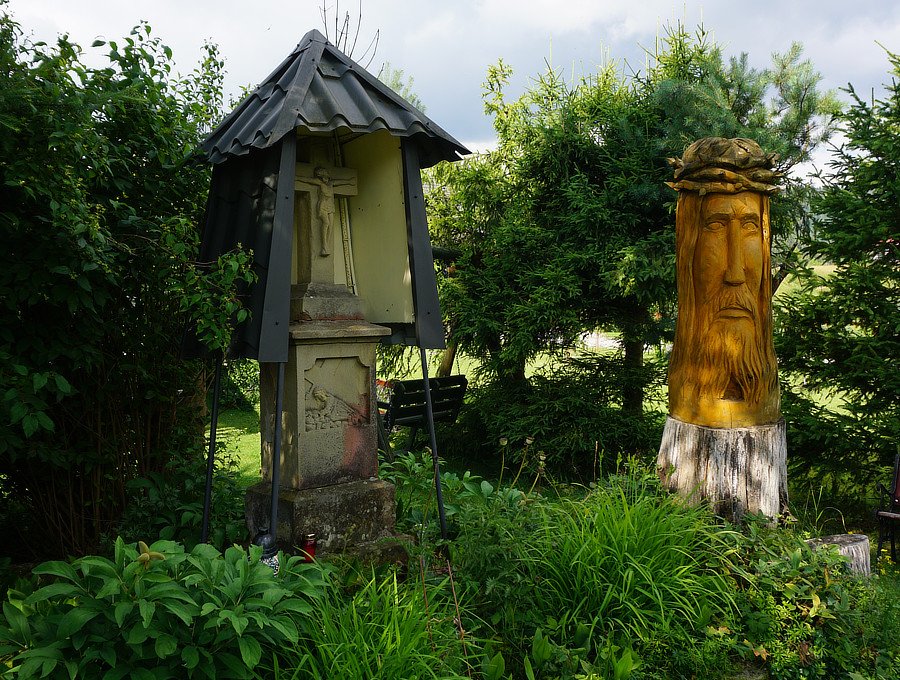 7. Kamienny krucyfiks słupowy, 1906 r., f. JAN KNAPIK I ROSALIA NIŻNIK [W ogrodzie posesji nr 343A, Ochlipów, Zubrzyca Górna]