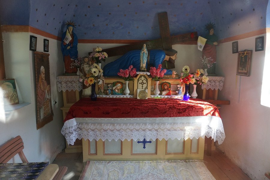 Wygląd. Kapliczka domkowa, biała, murowana, z wnęką w szczycie i dzwonnicą. W środku figura Chrystusa upadającego pod krzyżem. Wysokość ok. 6 metrów. Stan bardzo dobry. Zewnątrz. Biała, murowana na planie prostokąta, tynkowana. Fasada z pilastrami przy narożach. Drzwi zwieńczone łukiem, drewniane, brązowe, oszklone. Szczyt murowany, z wnęką, w niej malowany na desce Veraicon. Na brązowym tle twarz Jezusa z brązowymi włosami i brodą, złotym nimbem, w białej szacie, na tle białej chusty. Dwa okna, brązowe, drewniane. Dach dwuspadowy, z brązowej blachy, przybitka biała. Zwieńczona niedużą wieżą z dzwonem. Wewnątrz. Ściany białe, strop kolebkowy niebieski ze złotymi gwiazdami. Pod ścianą tylną żółty drewniany ołtarz, z białymi płycinami różnej wielkości, obramowanymi jasno brązowo, środkowa z krzyżem równoramiennym. Przykryty białym obrusem i czerwoną narzutą. Na mensie drewniany stopień, z podobnymi płycinami malowanymi na licu. Na stopniu gipsowa figura upadającego Jezusa. Postać z brązowymi włosami i brodą, w niebieskim płaszczu, skierowana w prawo. Nad figurą drewniany, brązowy krzyż z czarnym napisem: NOSTRO IPSE PORTAVIT oraz NOSTRO IPSE LULIT ET DOLORES. Przed figurą, na mensie, stoi skrzynka na wzór tabernakulum, przed nim biały korporał i patena. Na niej figurka NMP ze złożonymi modlitewnie rękami, w białej sukni i niebieskim płaszczu. Po bokach dwie ceramiczne, malowane płaskorzeźby z popiersiami NMP po lewej i Jezusa po prawej, obok nich dwa aniołki w niebieskich szatach. Po lewej gipsowa figura św. Józefa z Dzieciątkiem, obok mniejsza, Jezusa z sercem gorejącym. W narożach kaplicy, na osobnych stolikach, obok ołtarza, po lewej figura Matka Bożej. Po prawej stronie święty Jan Drewniany krzyż z metalową figurką Jezusa. Na ścianach obrazki Drogi krzyżowej, kilim, obraz św. Jana Pawła II. Otoczenie. Płot drewniany, malowany na brązowo. Dwie lipy po lewej stronie, jesion po prawej, modrzew z tyłu. Tradycja lokalna. Kwiaty sztuczne różowe w wazonie obok tabernakulum. Drzwi i płot ozdobione kokardkami żółtymi, czerwonymi i niebieskimi. Miejsce majówek i odprawianych niegdyś mszy świętych.