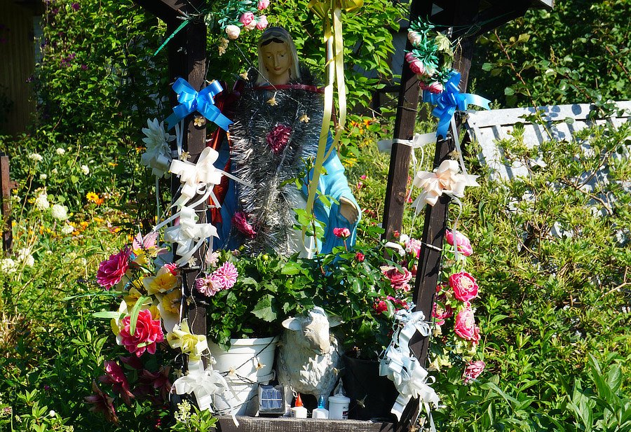 10. Drewniana kapliczka z figurką Najświętszej Marii Panny Niepokalanie Poczętej , XX-XXI w., [W ogrodzie przed domem 326, Zubrzyca Górna. Przy skrzyżowaniu do Zimnej Dziury ]